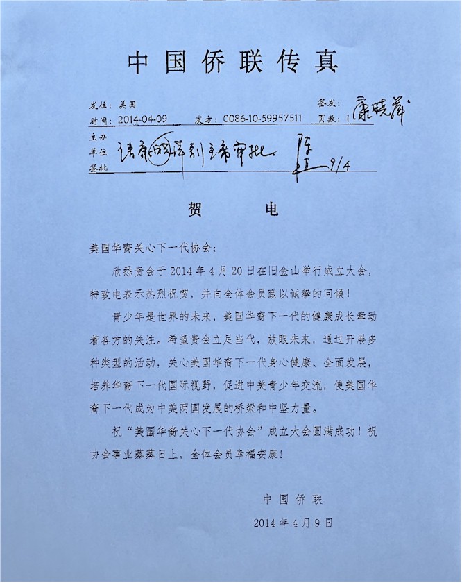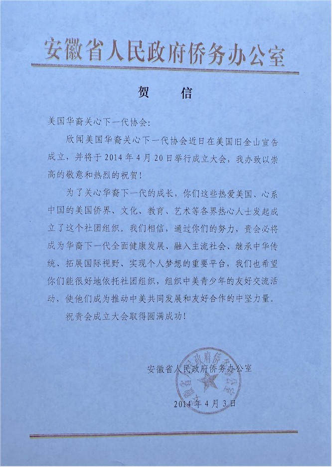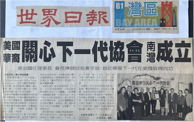 美国华裔关心下一代协会于2014年4月20日在旧金山南湾Cupertino成立,前身为2002年成立的美国青少年文化交流中心。