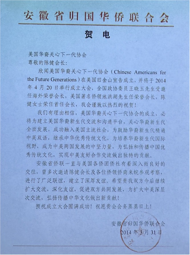 美国著名侨领、中国海外交流协会常务理事池洪湖先生担任荣誉会长,中国全国政协委员王晓玉先生受邀担任海外荣誉会长,蒋治国博士任理事长,陈健女士(现任北加州安徽同乡会会长)为首任会长。